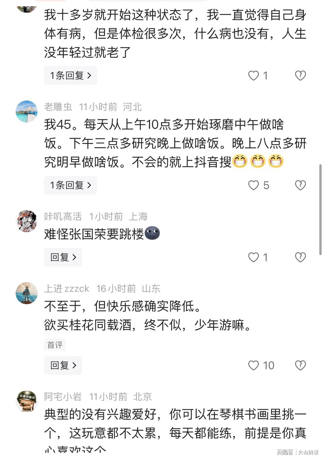 针对此事,有网友表示,我十多岁就开始这种状态了,我一直觉得自己身体有病,但是体检很多次,什么病也没有,人生没年轻过就老了。