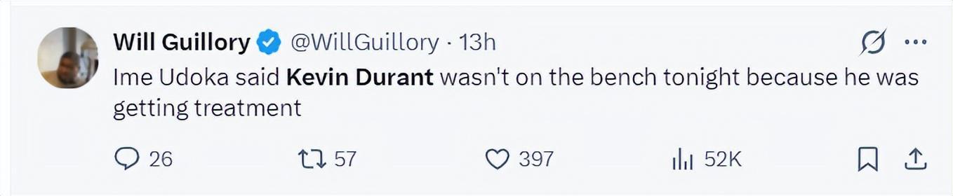 赛后乌度卡谈到了为什么杜兰特没有在替补席跟全队在一起,乌度卡说因为杜兰特在接受治疗。(申京也说希望杜兰特治疗后能在G4中复出)