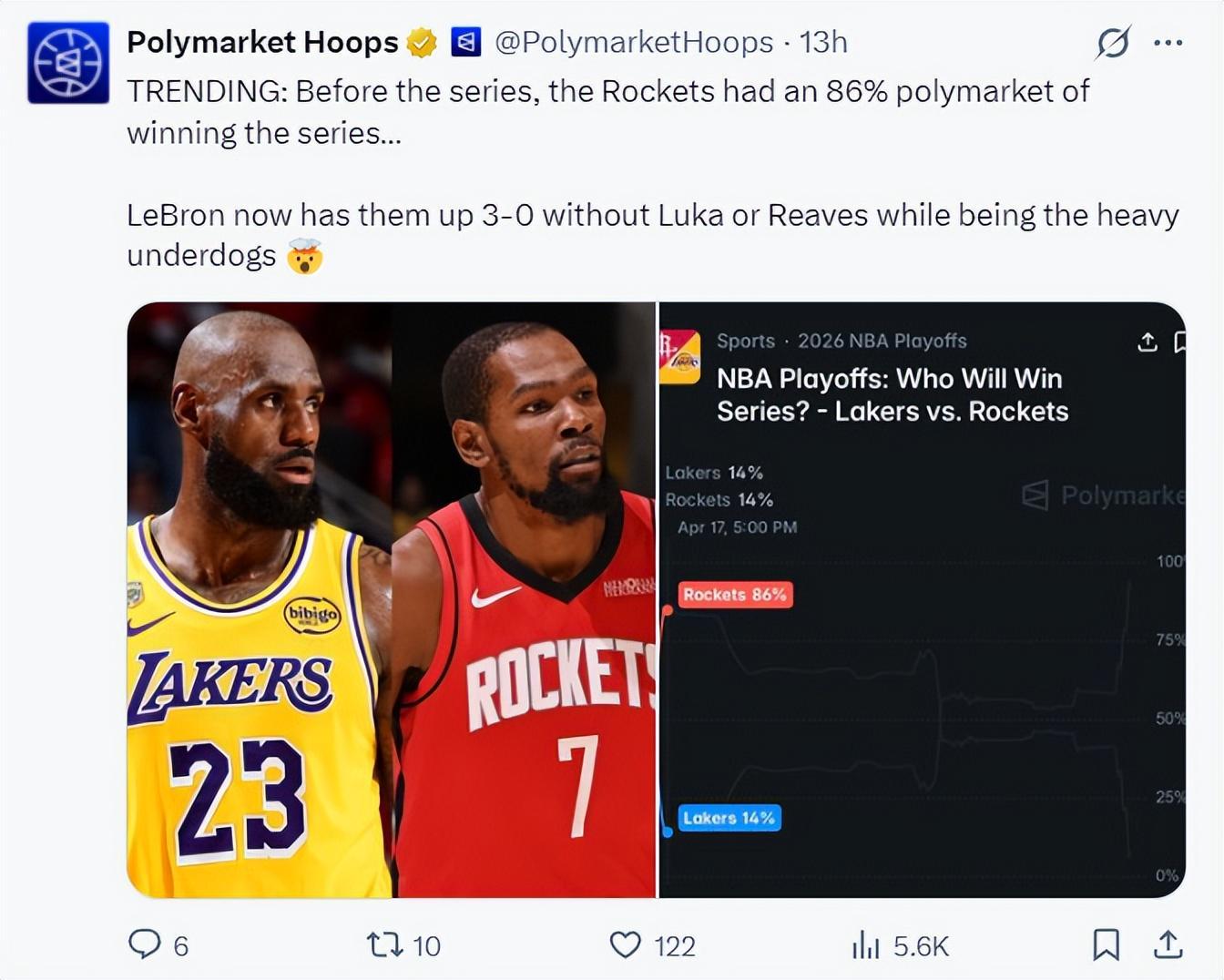 在湖人VS火箭系列赛开始之前,火箭队的晋级概率高达86%,因为那时候杜兰特没伤,而东契奇、里夫斯首轮大概率要报销,都觉得41岁的勒布朗已经没有带队赢球的能力,如今两级反转。