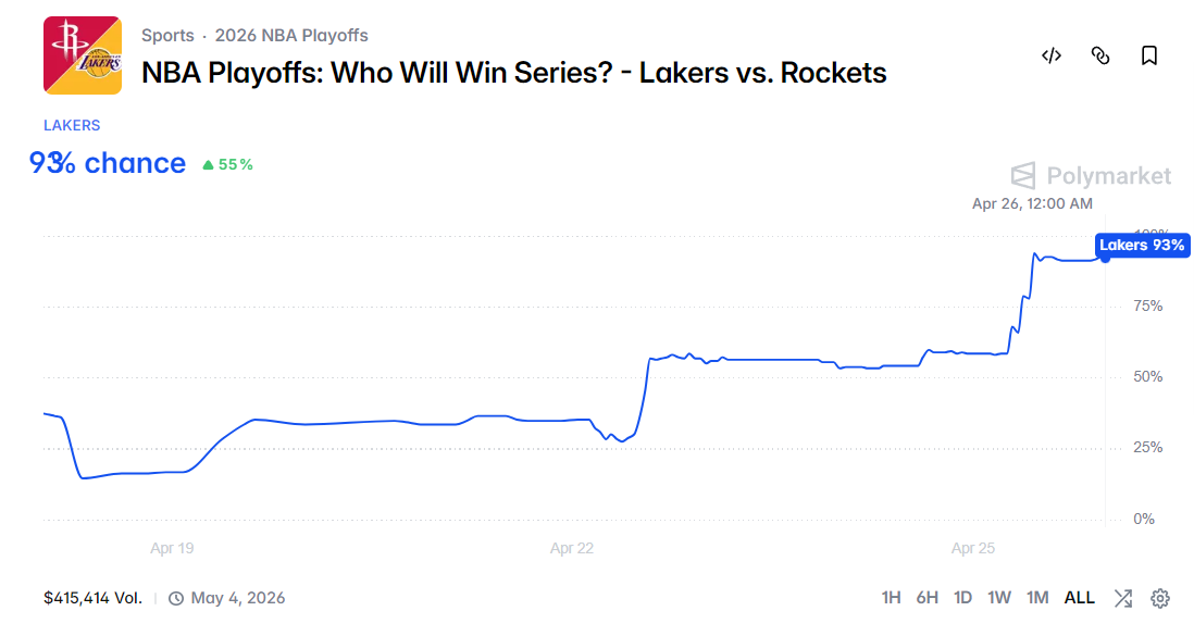 最新的晋级概率火箭队只剩下7%,而湖人晋级概率高达93%,火箭队生死一线。