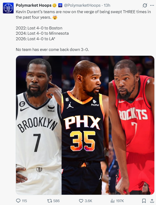 美媒晒出杜兰特过去四年季后赛首轮,2022年首轮被绿凯横扫,2024年首轮被森林狼横扫,2026年首轮0-3落后湖人,预测他大概率要第三次被横扫了。(2023年太阳首轮4-1淘汰快船,次轮2-4不敌掘金)