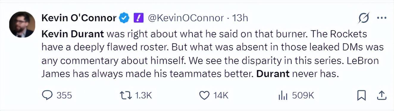 NBA记者凯文-奥康纳重提杜兰特疑似小号事件,他表示那封邮件也有正确的,火箭队阵容的确非常畸形,从系列赛能看出詹姆斯可以让队友变好,而杜兰特却从未做到这一点。