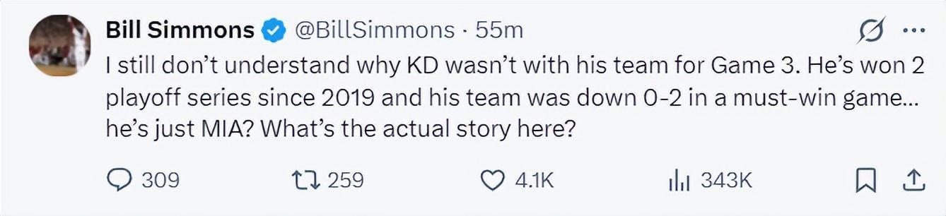 名嘴比尔-西蒙斯则很不满杜兰特在如此关键的比赛不跟球队在一起,杜兰特这种行为没有凝聚力,自2019年以来他只赢过两轮季后赛,当他的球队0-2落后他却这样不见了?