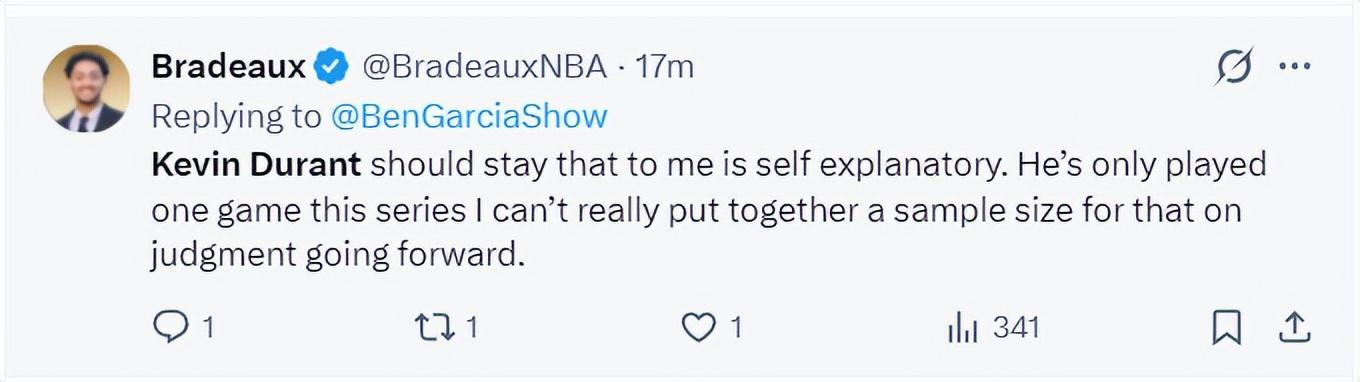 休媒还是希望杜兰特继续留在火箭阵容中,毕竟这轮系列赛他只打了一场,比赛的样本太少无法做出判断,还需要打更多的季后赛才能看出是否适配。