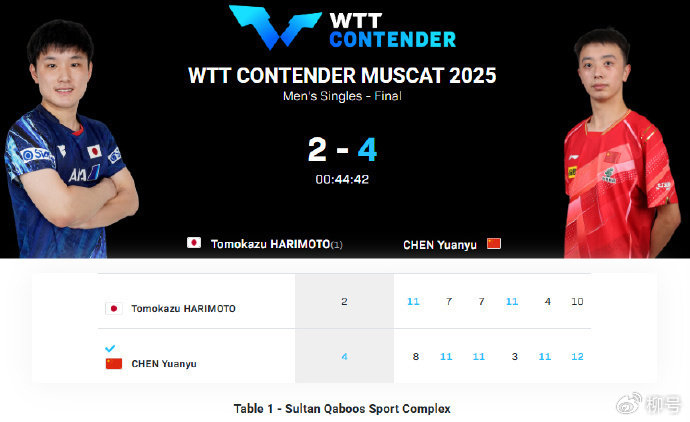 小将陈垣宇也参加了WTT球星挑战赛多哈站的角逐,可惜在1/16决赛,与队友薛飞的比赛中,2-3惜败无缘晋级,对手获胜的五局比分为:11-9、7-11、10-12、11-4、11-4。带着WTT球星挑战赛多哈站的些许遗憾,陈垣宇背靠背出战WTT常规挑战赛马斯喀特站。